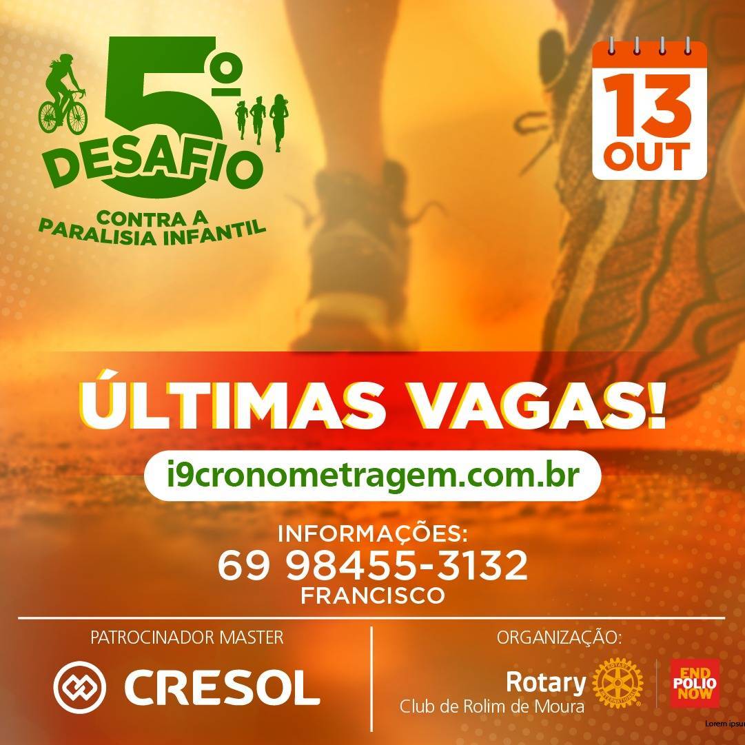 Inscrições e Regulamento no Site: https://i9cronometragem.com.br/5o-desafio-contra-a-paralisia-infantil-do-rotary-club-de-rolim-de-moura/